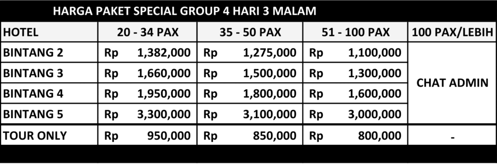 - Harga di atas merupakan harga Per Orang (Pax), sudah termasuk PPH dan PPN.